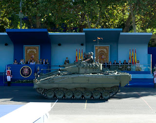 Los actos del día de la Fiesta Nacional han comenzado pasadas las 10.35 horas con lallegada de los reyes a la plaza de Neptuno de Madrid, donde don Juan Carlos ha pasado revista a las tropas a bordo de un vehículo militar.